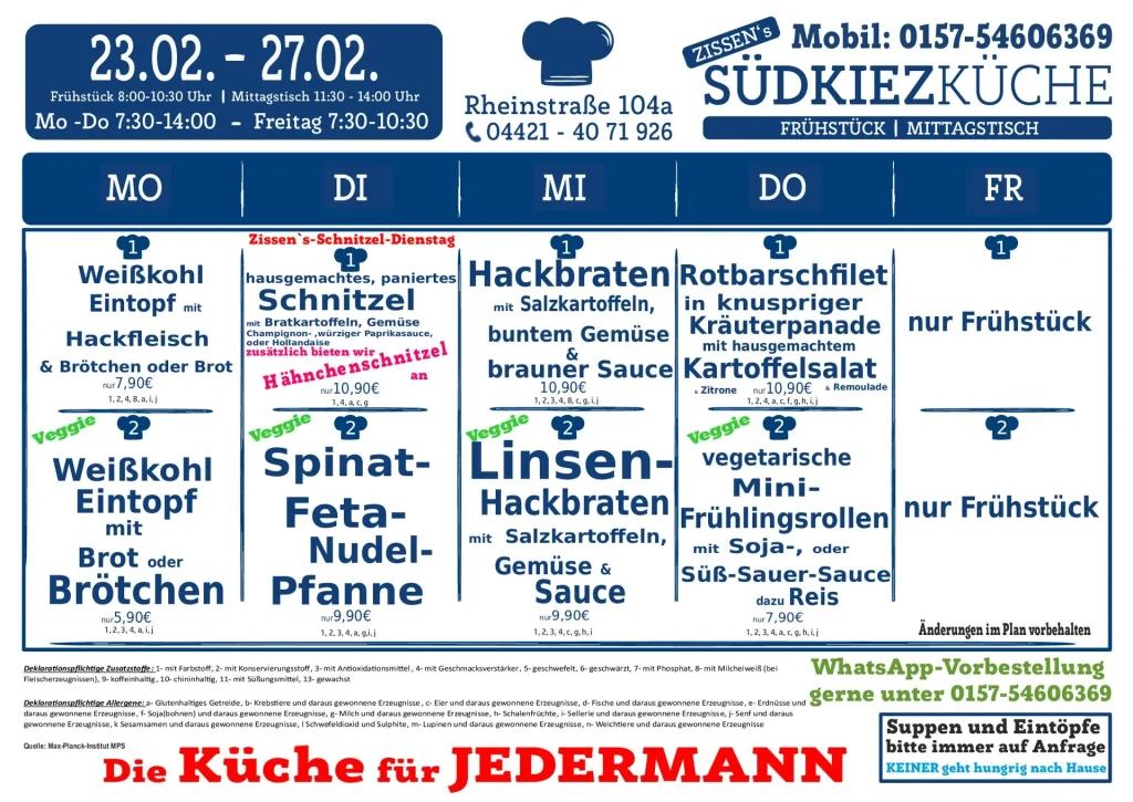 Vorbestellungen sind sehr erwünscht, denn sie helfen uns sehr. Erstens beim Vermeiden von Abfall und zweitens dabei, dass keiner hungrig wieder gehen muss. Telefonisch unter 04421-4071926 oder per WhatsApp unter 0157-54606369.